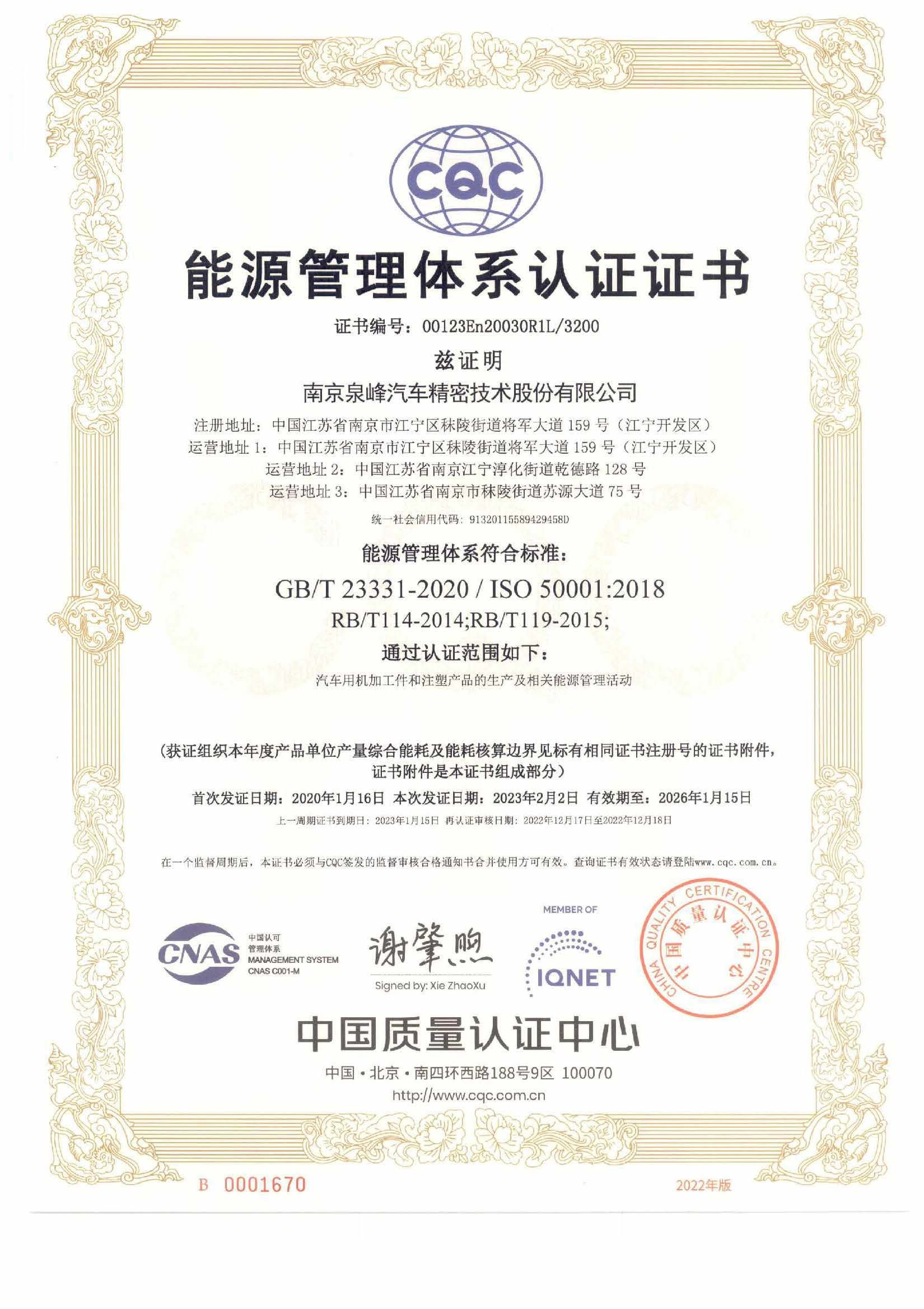 南京泉峰ISO50001證書(shū)