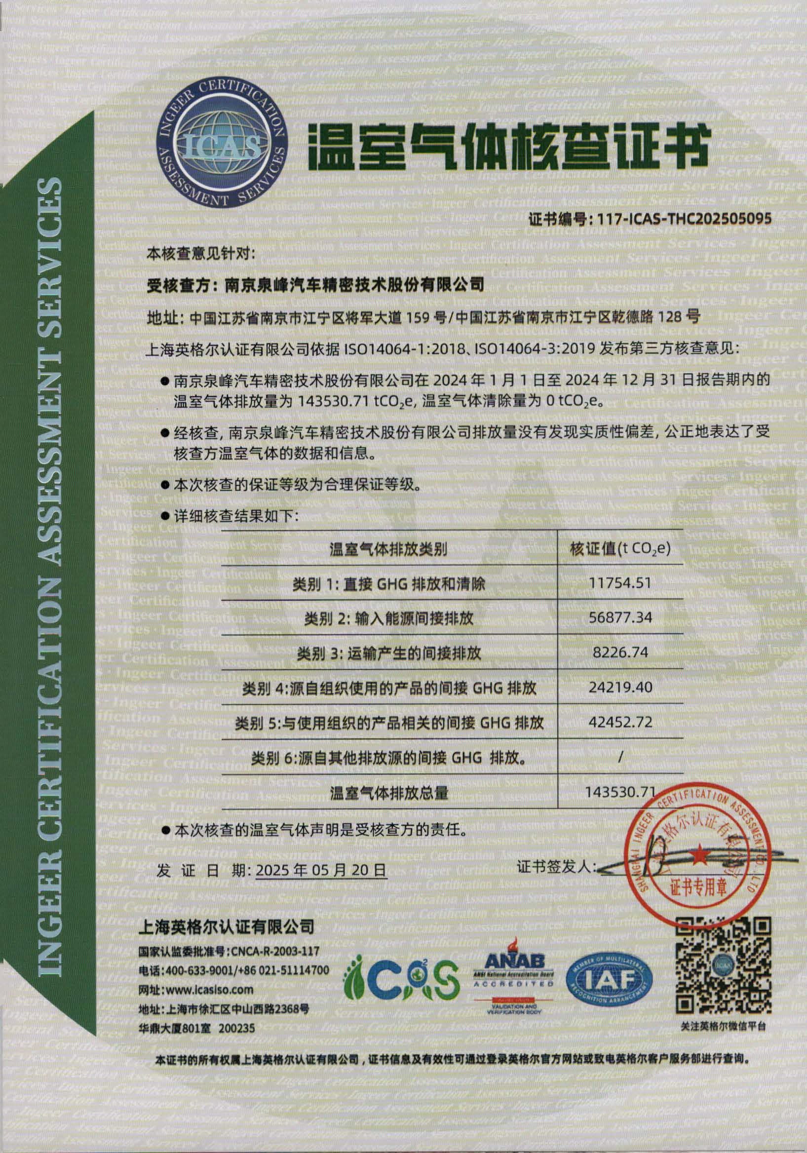 南京泉峰ISO14064證書(shū)